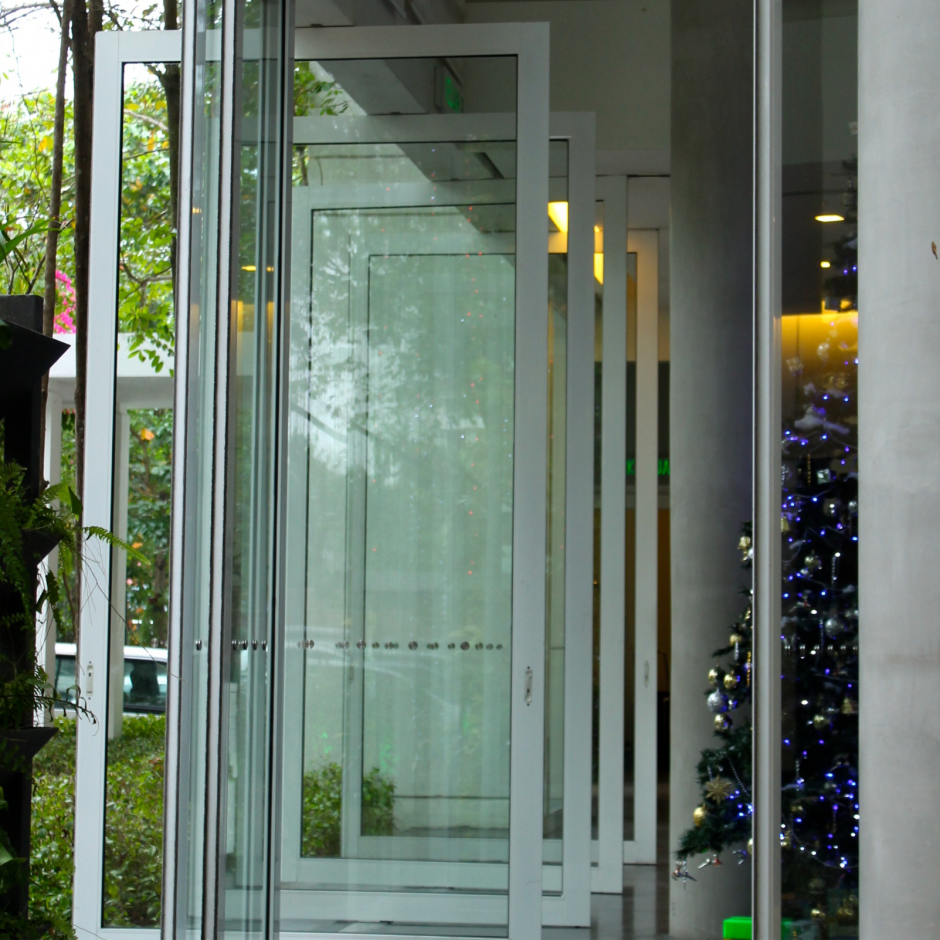 Mostly used in shopping centres, the Henderson Stacking system allows the doors to stack away, creating a completely unobstructed entrance, with the doors neatly stacked into a cavity.